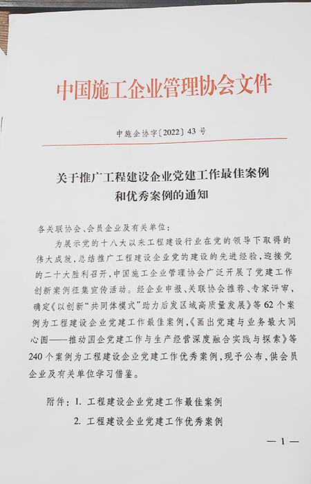 近日,中國施工企業(yè)管理協(xié)會開展了黨建工作創(chuàng)新案例征集宣傳活動,經過專家評審,公司申報的《以“12345”黨建工作思路引領高質量發(fā)展》入選“工程建設企業(yè)黨建工作優(yōu)秀案例”。